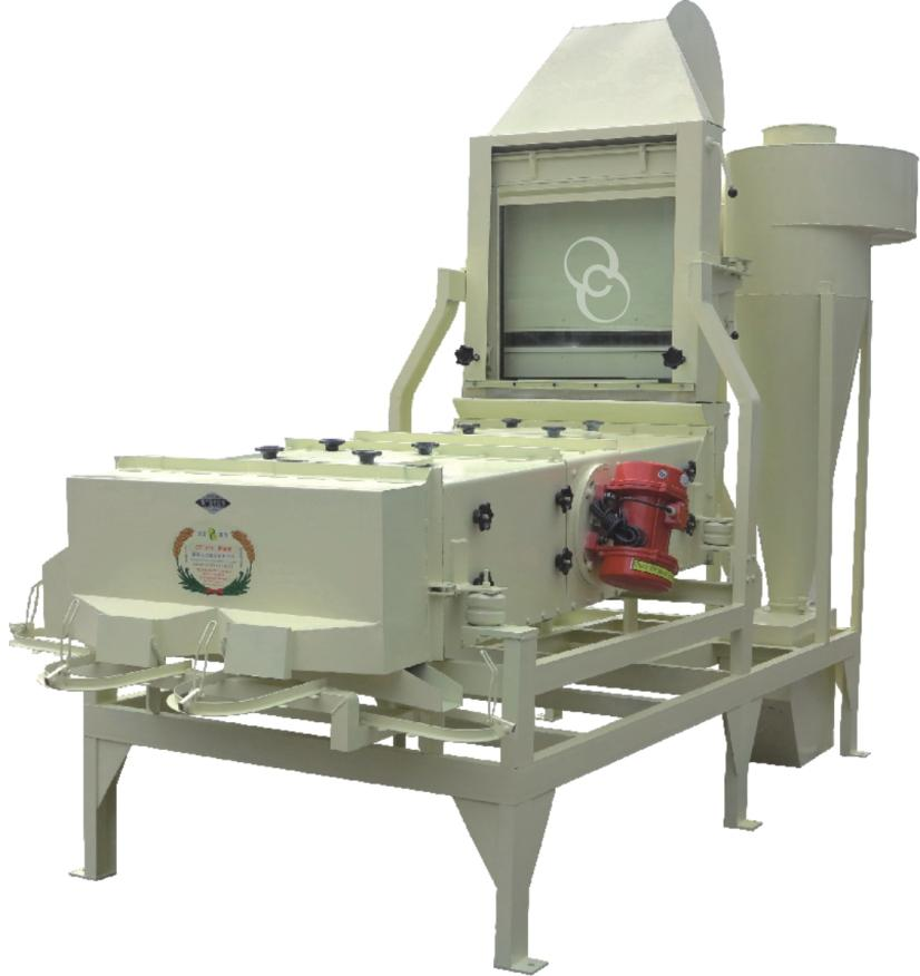 該粗選機是風篩式加工機械,可對多種物料利用空氣力學特性進行風選,可分離出不飽滿的物料,輕雜(秸枝、樹枝、麻繩、粉塵等)。該粗選機除清選外,還可以進行分級處理。不受場地限制,一般加工廠均可使用。此機型可單機使用,配合整廠設備(如比重機、選石機、天小選別機、磨光機…等)效果更佳。